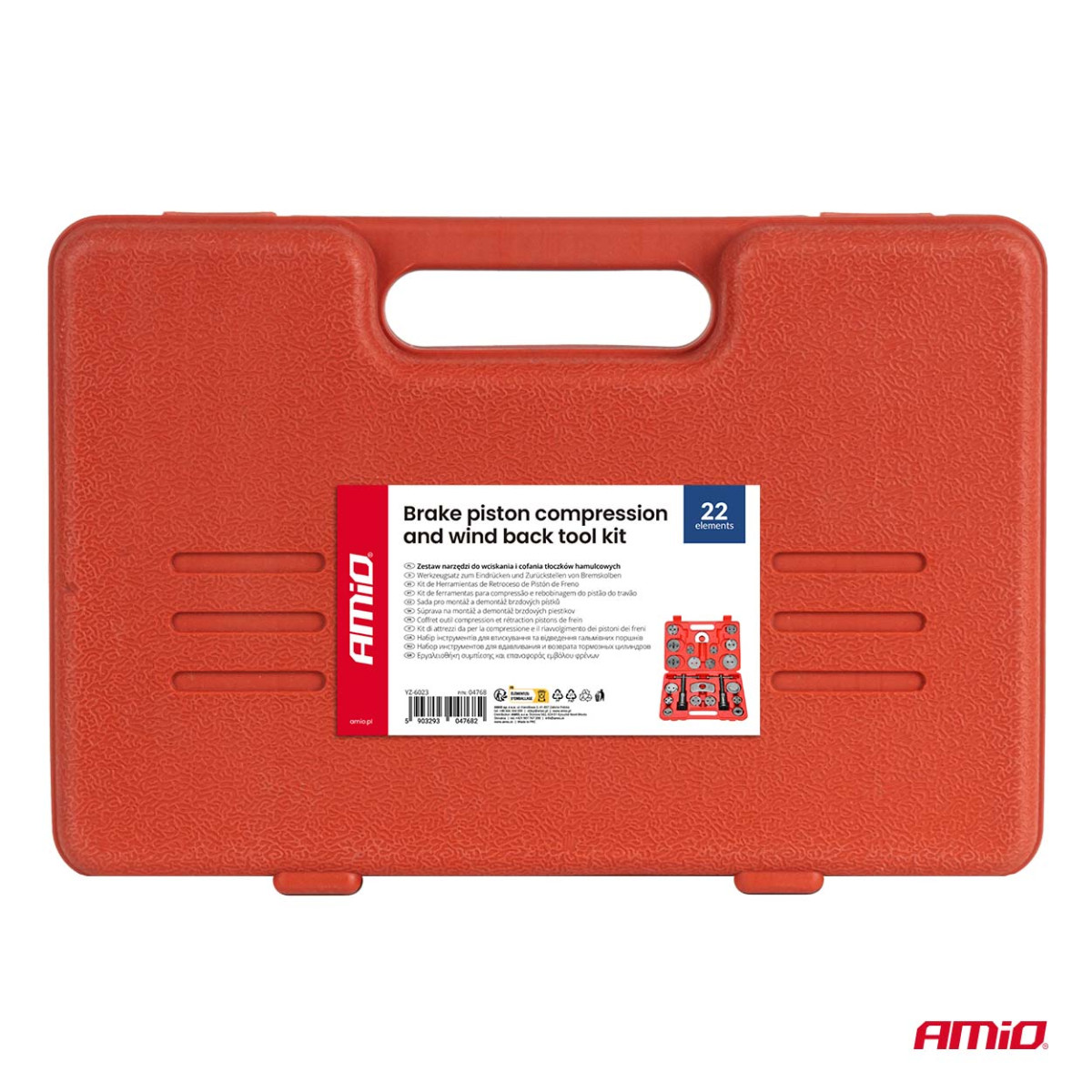 Brake caliper piston pressing and screwing tool set, 22 pcs. AMIO-04768
