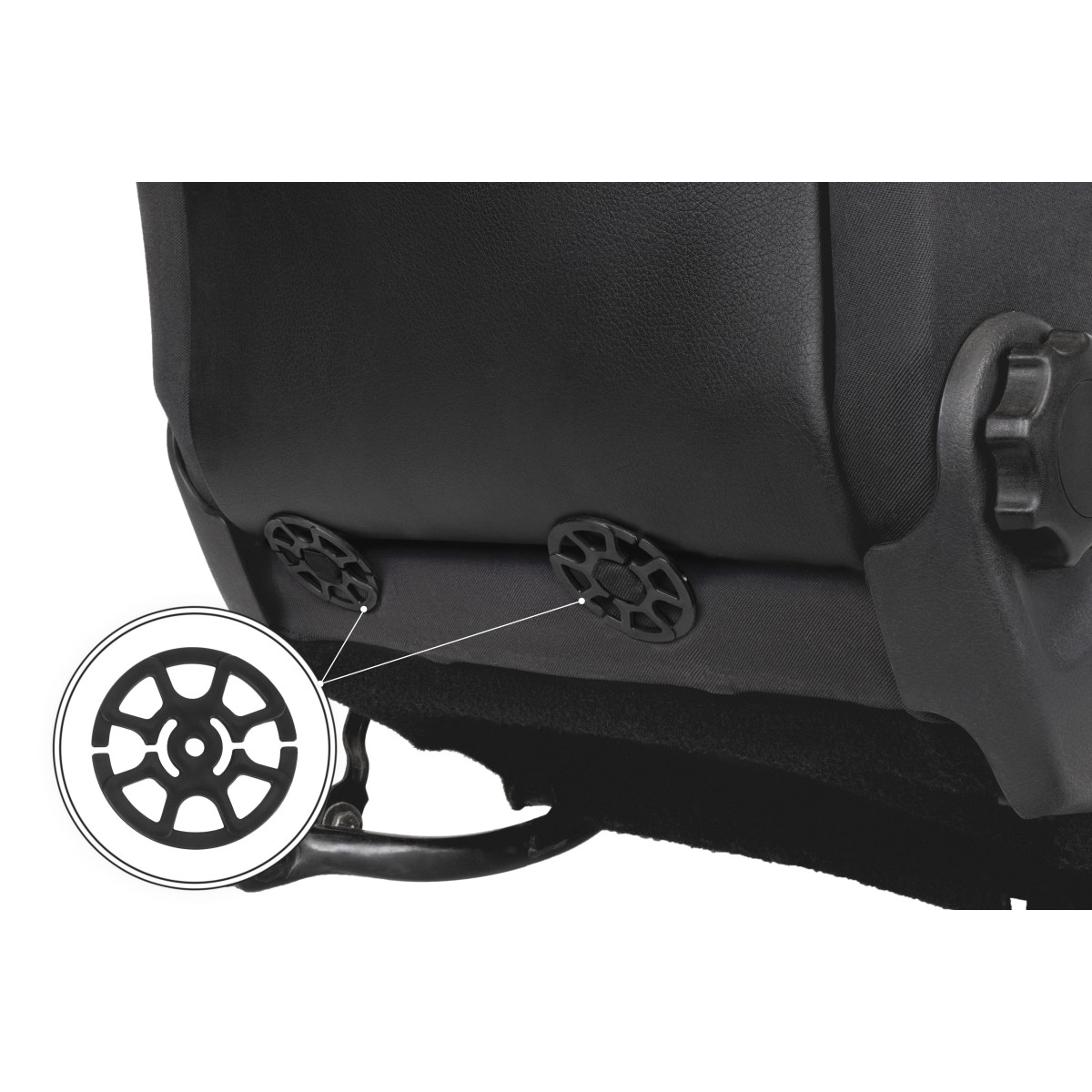 - Front covers attach underneath the seat and at the back using plastic ring clips between the seat cushion and backrest