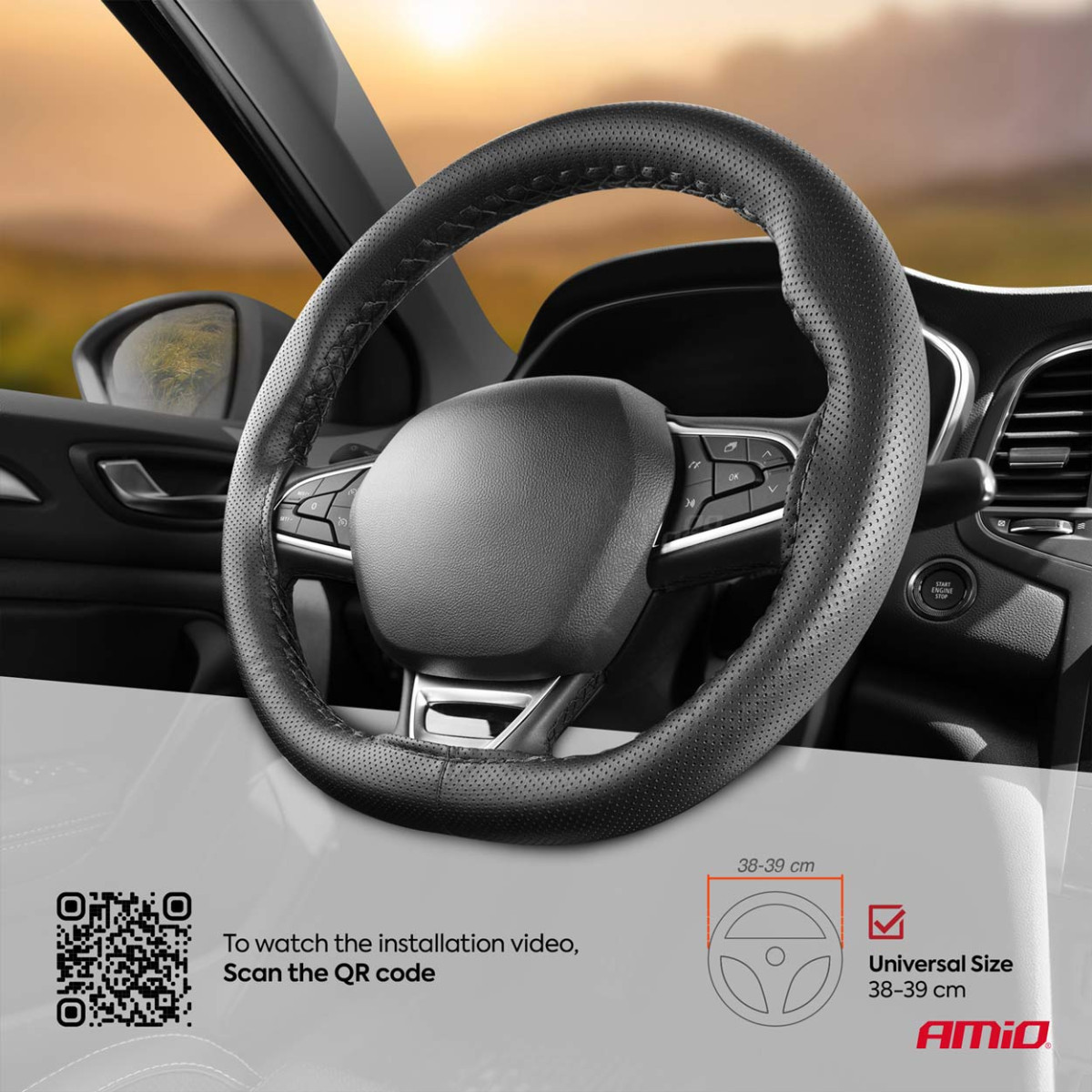 Perforated steering wheel cover with needle and thread 38-39 cm - black / black stitching