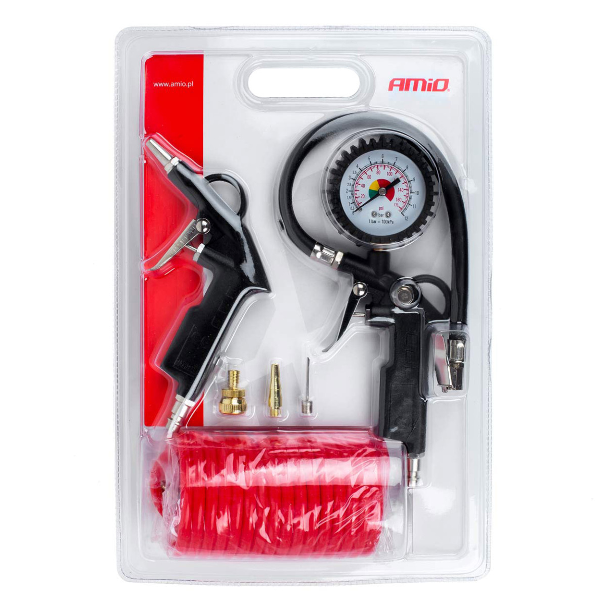 Pneumatic tire inflation gun with pressure gauge - an indispensable tool in any garage. The gun is convenient, lightweight, practical and aesthetically designed. It has an air release valve and a rubber pressure gauge protection.