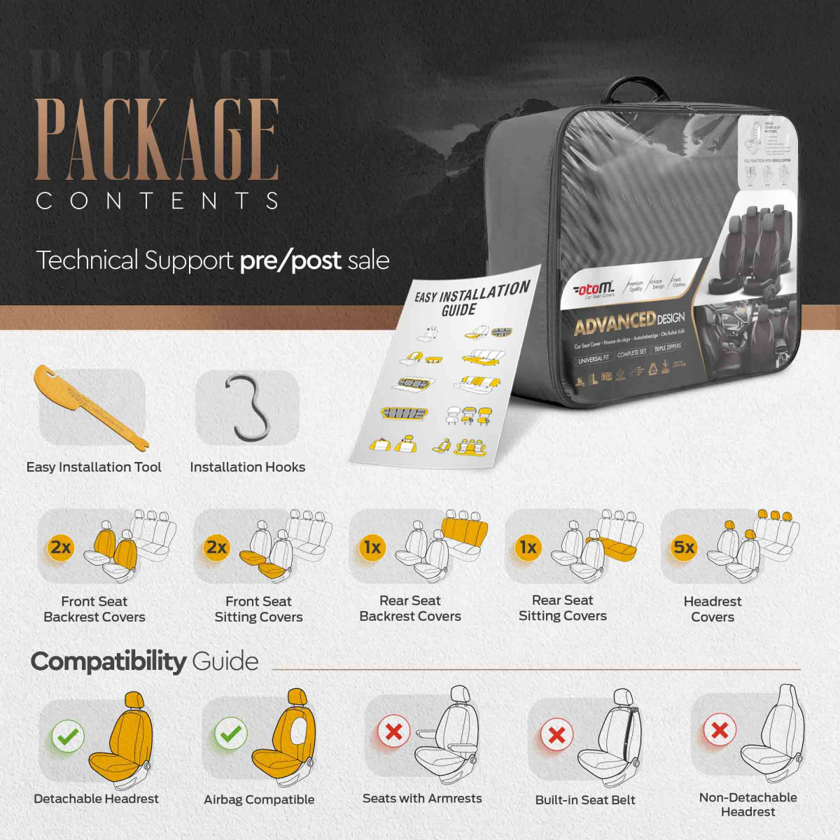 All materials are laminated polyurethane foam, which prevents the covers from slipping on the seats. The covers completely cover the seats, so they perfectly protect them from dirt, are durable and easy to clean. Fashionable designs update the car interior and improve aesthetics.