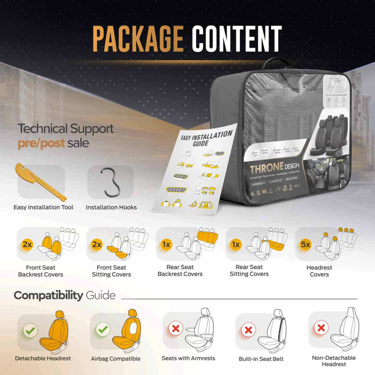 All materials are laminated polyurethane foam, which prevents the covers from slipping on the seats. The covers completely cover the seats, so they perfectly protect them from dirt, are durable and easy to clean. Fashionable designs update the car interior and improve aesthetics.